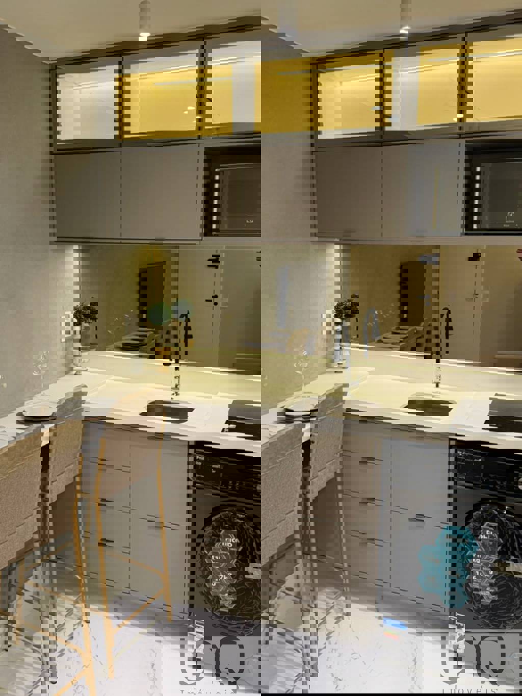 Armários planejados na cozinha e sala com vidros reflecta
