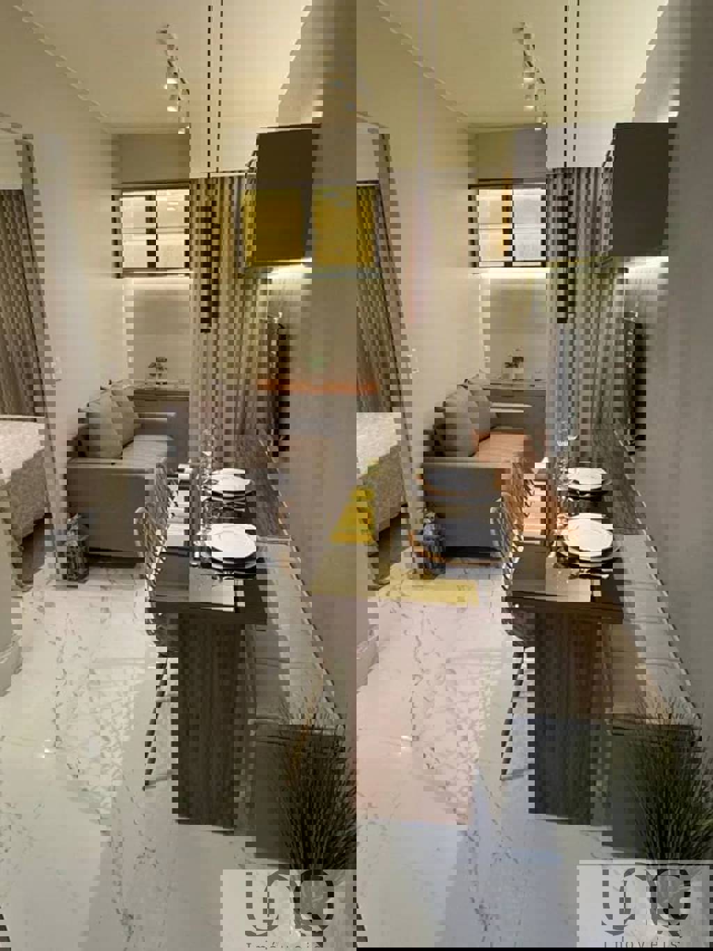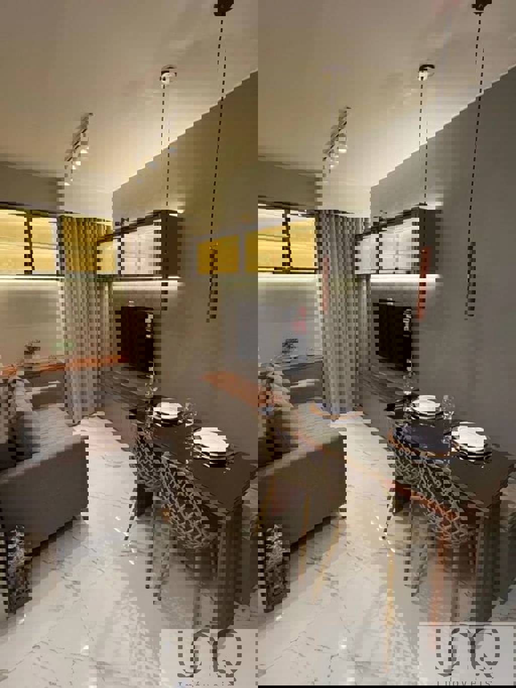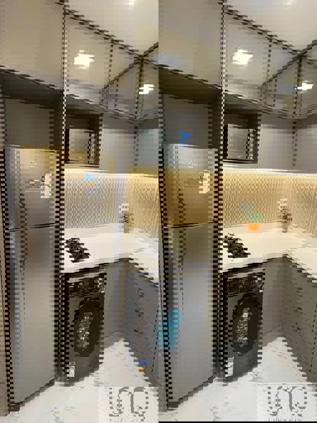 -Iluminação moderna em trilhos; Inclui: -Máquina Lava e Seca -TV smart 50” -Sofá sob medida em linho; -Cama box com colchão; -Microondas Electrolux ; -Geladeira eletrolux; -Ar condicionado Inverter; -cortinas em linho com blackout; -Cadeiras design;