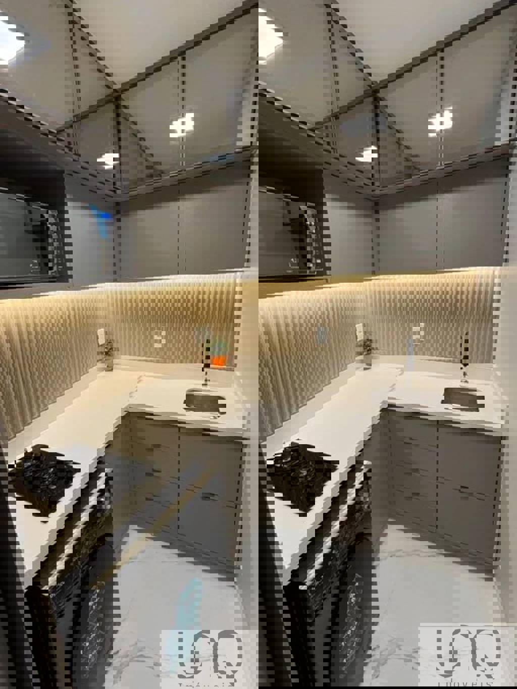 -Bancadas da cozinha e banheiro em silestone; -Piso em Porcelanato branco -Armários da cozinha e sala com vidros reflecta; -Cabeceira iluminada com nicho iluminado;