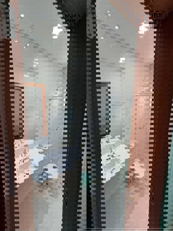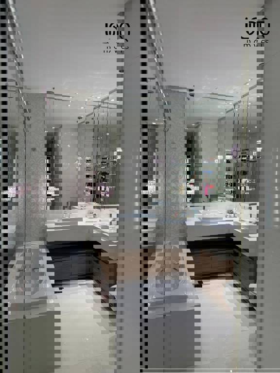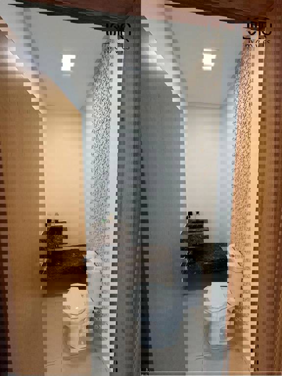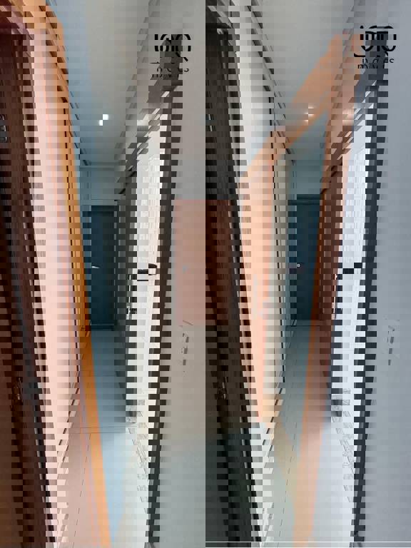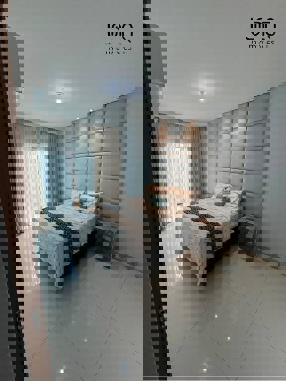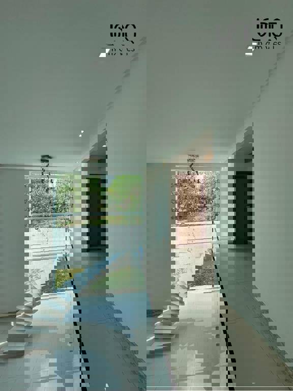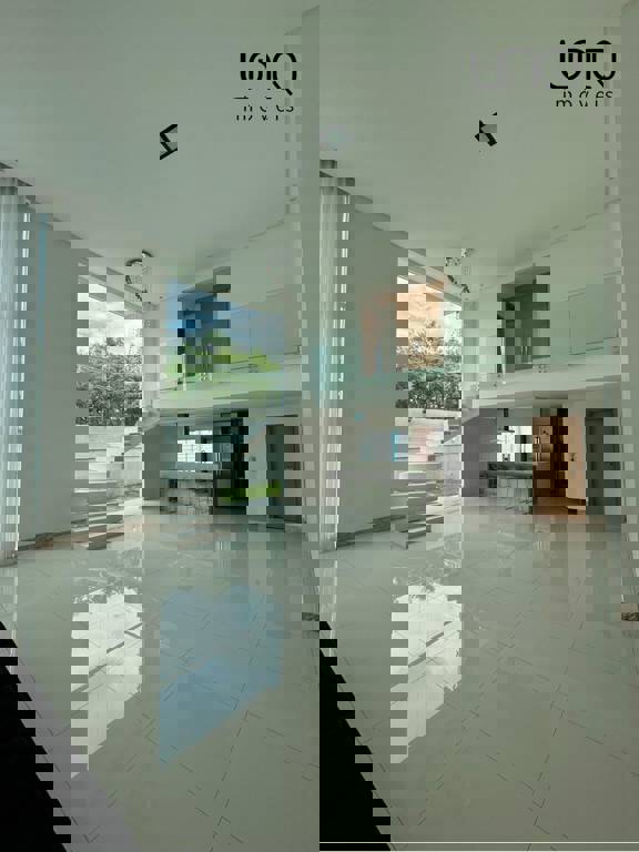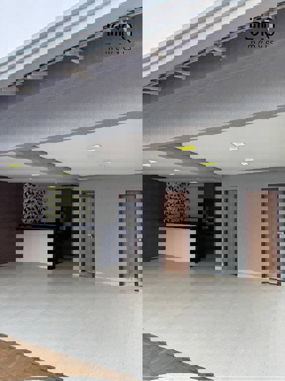 Pé direito duplo alto; projeto de iluminação em led; piso porcelanato 90x90.