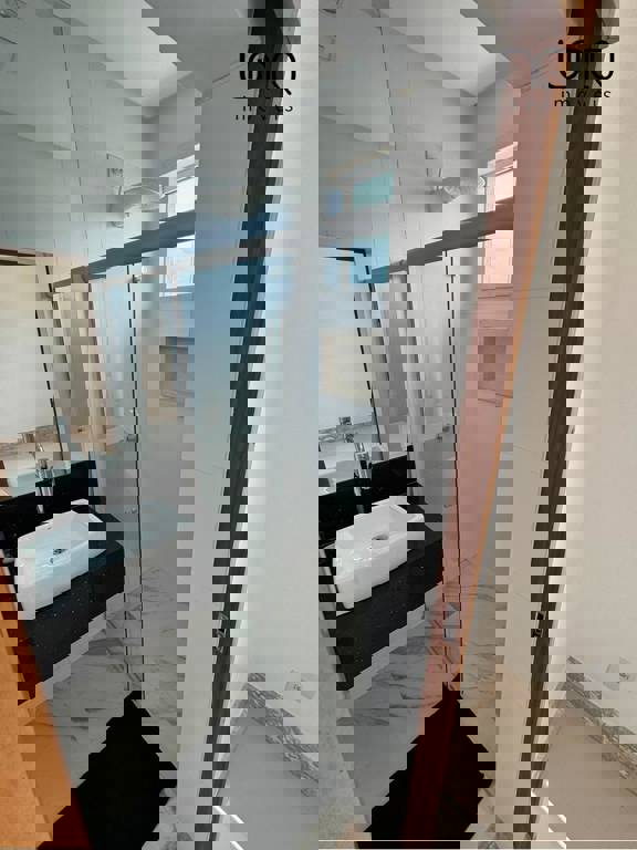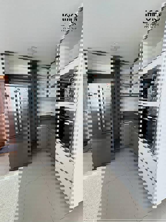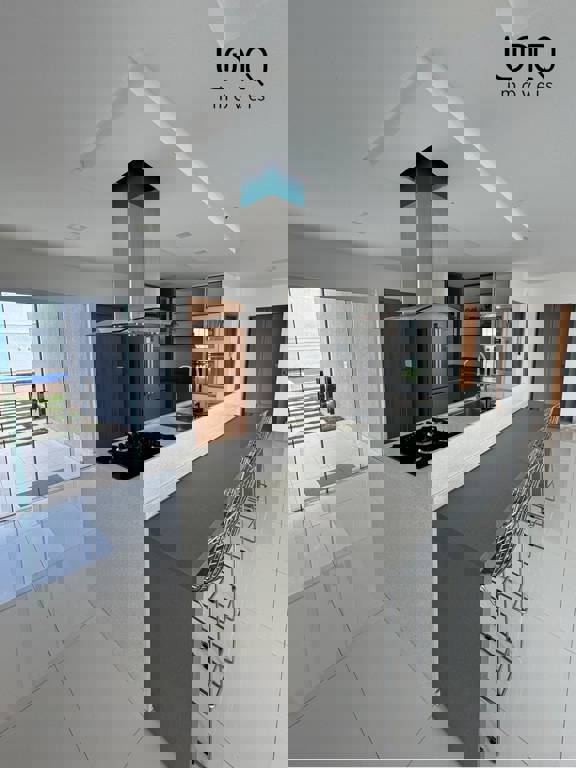 Ampla sala com vários ambientes; cozinha integrada com marcenaria de alto padrão; lavabo com fino acabamento; escada de mármore; despensa; lavanderia e DCE.