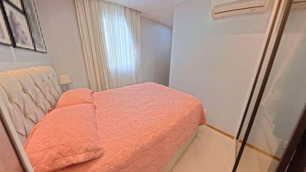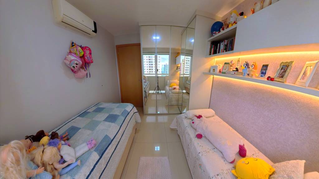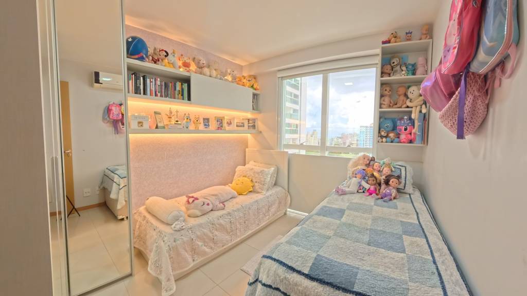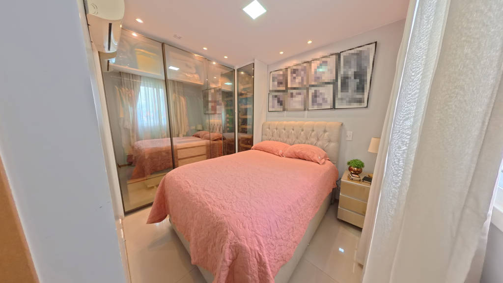 Quarto com armários planejados, porta com espelho, nichos funcionais e Ar Condicionado