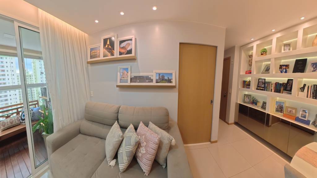 Logo ao entrar, a sensação é imediata: um espaço acolhedor, iluminado e perfeitamente planejado. A sala para dois ambientes, integrada e rica em detalhes, conta com estante planejada e projeto de iluminação, criando um ambiente ideal tanto para relaxar quanto para receber.