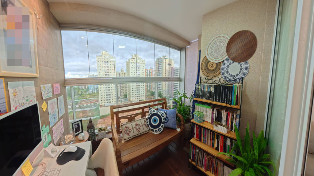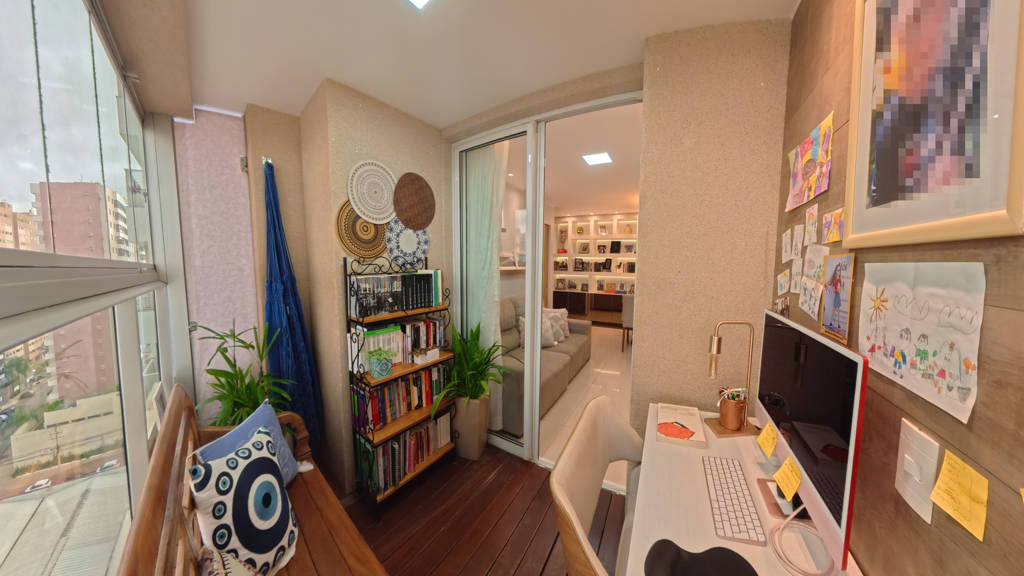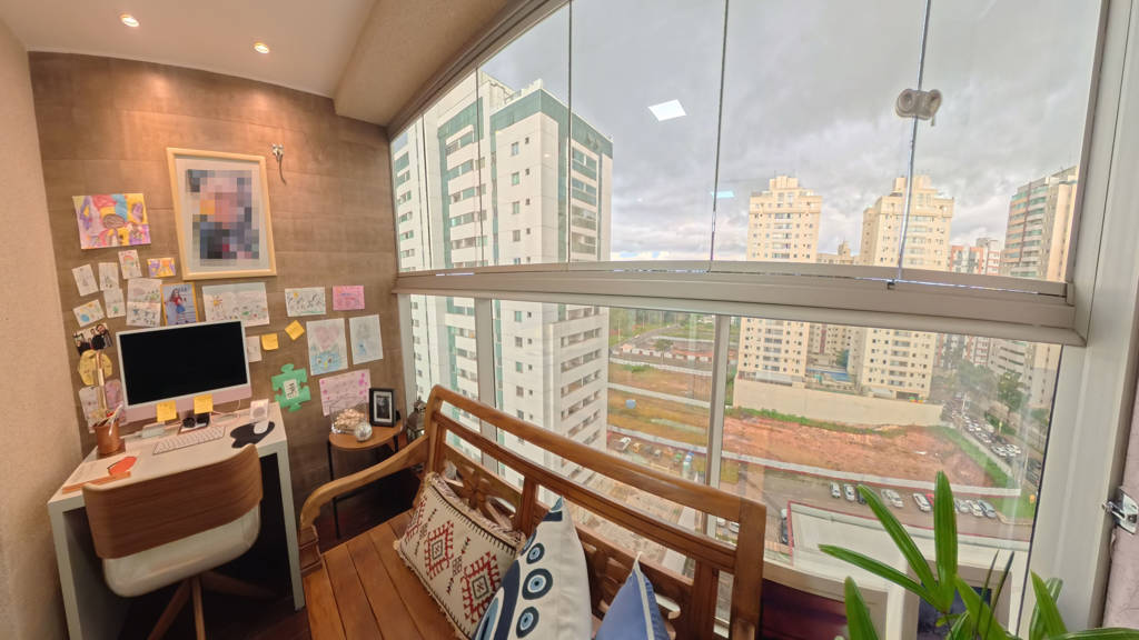 A varanda, um dos grandes destaques, foi transformada em um escritório aconchegante, com piso em madeira e cortina de vidro, oferecendo um espaço silencioso e inspirador para o dia a dia.