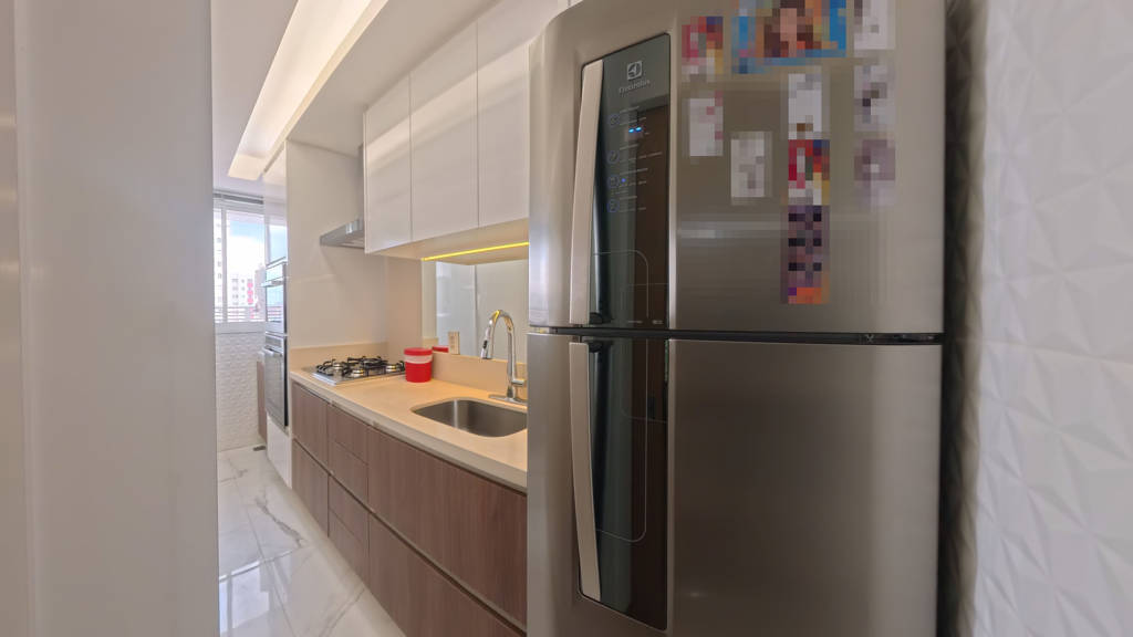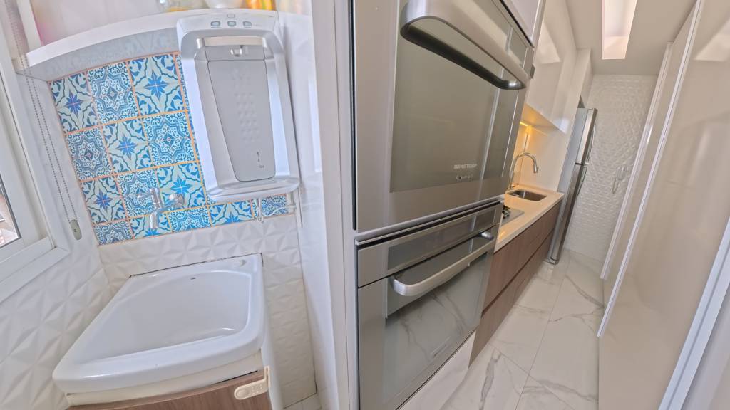 A cozinha é um verdadeiro convite ao convívio: totalmente reformada, com armários planejados, bancada em granito branco, piso em porcelanato e torre quente. A área de serviço integrada, com espaço para lava e seca embutida, garante praticidade sem abrir mão da estética.